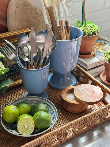 Our versatile Kirby Chambray Footed Cachepots feature a classic silhouette and deep, aqueous reactive glaze in a serene shade of blue. Made from high-fired stoneware, this simple, yet chic set of two footed cachepots are a timeless addition to any well appointed interior. Use as cachepot or plant directly into. Protect fine furniture by lining interior of pots.