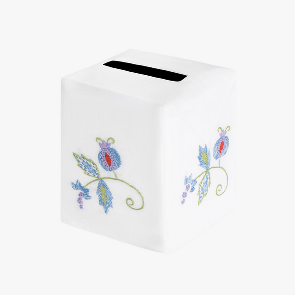 Our charming embroidered linen Pomegranate Tissue Box Cover will bring classic style to your home. This luxe little white linen embroidered tissue box cover is a welcoming touch to bedrooms and bathrooms.