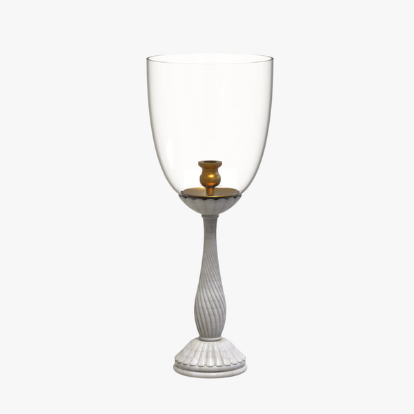 Our handcrafted Beaumont Tall Hurricane from designer Amanda Lindroth is a timeless addition to any well appointed interior. The elegant pedestal is hand carved from found natural bone in a gathered twist silhouette and crowned with solid brass candle holder and mouth-blown glass hurricane. Amanda loves this statement-making accent gracing an entryway console, paired on a deep mantel, and marched in multiples down the center of a dining table.