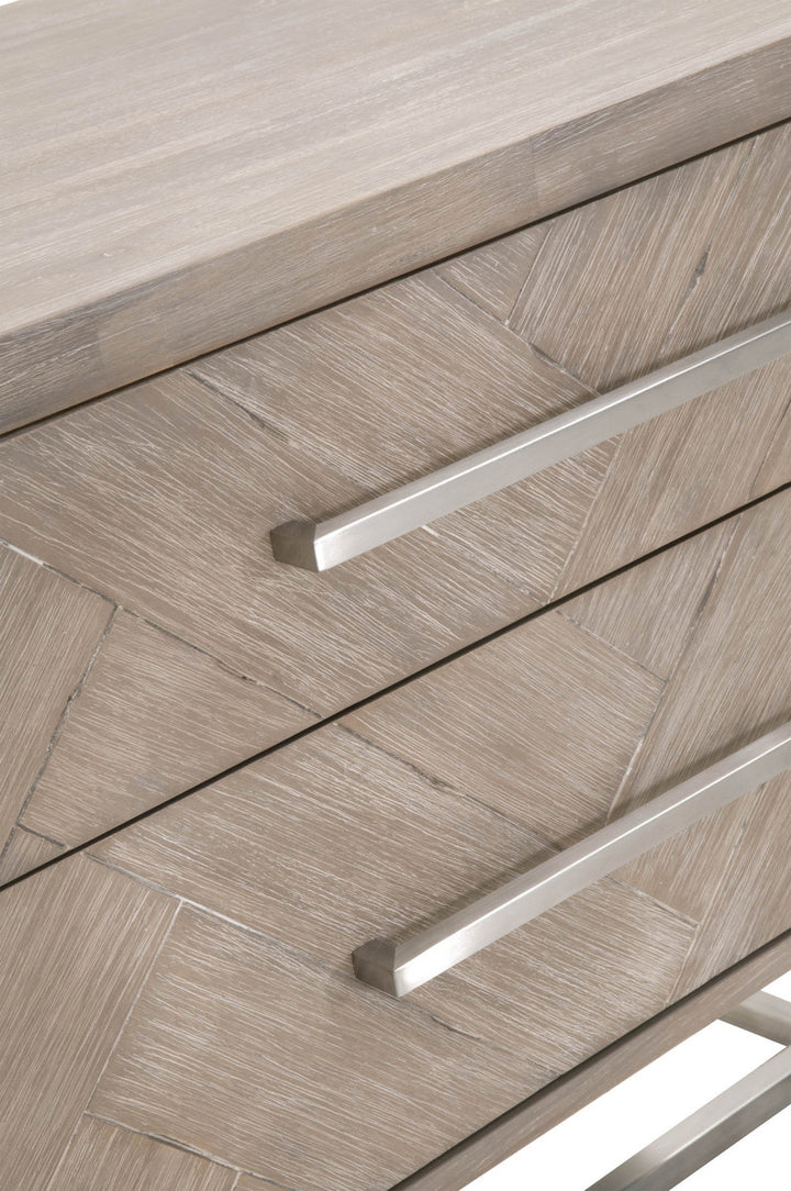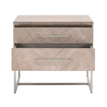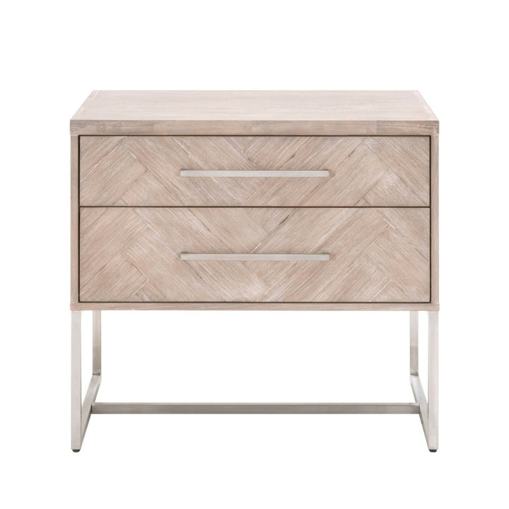Our Herringbone Greywash Nightstand is constructed from beautiful acacia veneer with a subtle grey finish. This eye catching two drawer nightstand features a chevron pattern and simple, yet chic brushed stainless linear hardware and legs. This versatile bedside table will lend timeless appeal to any well appointed bedroom or living space.