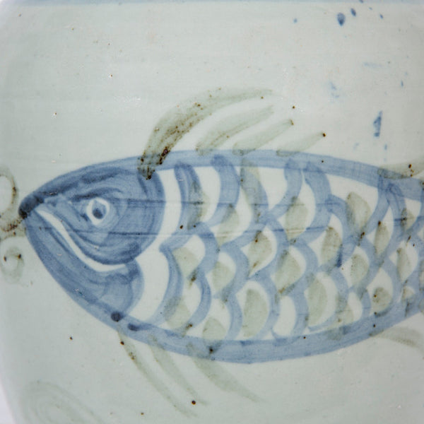Our vintage inspired Koi Fish Vase features two hand painted fish and classic stripes. This timeless blue and white jar shaped vase will lend chinoiserie inspired style to any decor. Finished with a unique aging process for an antique appeal. Small chips and color variation are inherent to the design.