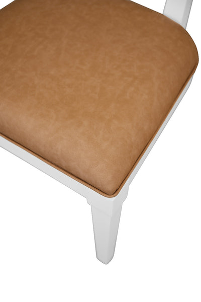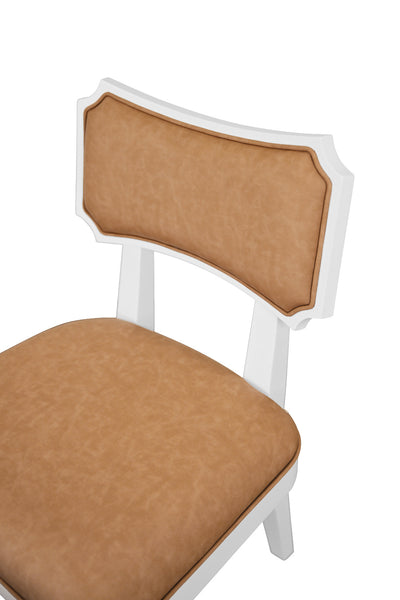 Our bow back Heston Camel Dining Chair exudes classic style and timeless charm. Graceful curves and soft textures define the classic Heston side chair, where comfort meets quiet sophistication. Upholstered in faux camel leather, its seat is framed in matte white lacquered wood for a designer look. Perfect for dining tables and daily gatherings, this chair combines refined style with lasting comfort.