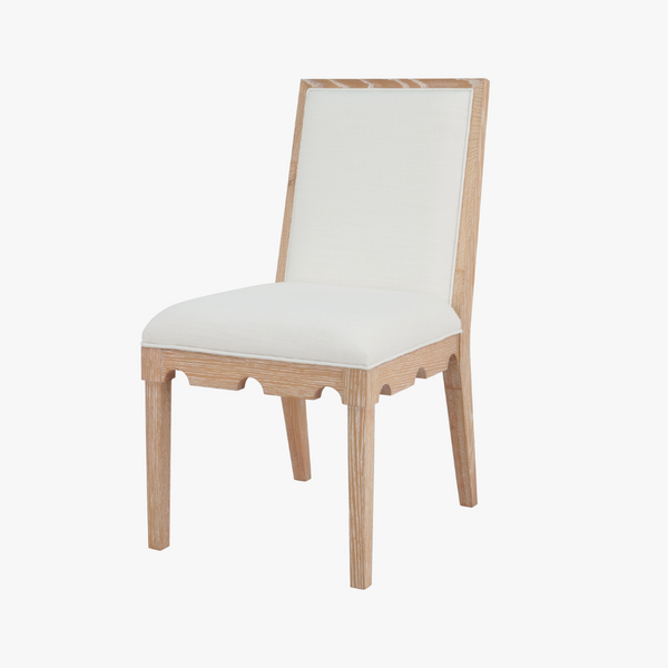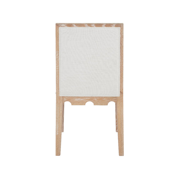 Our Lancaster Oak Chair exudes classic style and timeless charm with its square back silhouette and apron cutout designs. A natural cerused oak finish accents the natural wood grain and lends an organic appeal. The crisp performance fabric upholstered seat and back make this eye catching dining chair a perfect addition for well appointed interiors, whether placed in a coastal cottage or stylish urban abode.