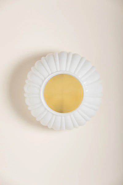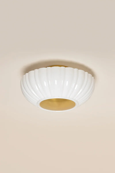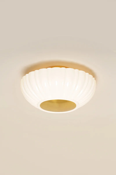 Our classic Anne Flush Mount from designer Zoe Feldman features a large opal glass shade with fluted edges. The metalwork is finished in timeless aged brass, adding a luxurious note. Anne recalls Art Deco designs while providing warm illumination to a living room, bedroom, or office space. The perfect addition to any well appointed interior, whether placed in a coastal cottage, city apartment, or refined suburban abode.
