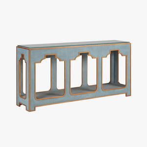 White Lacquered Linen Console Table measures 54" W X 32" H X 17" D.