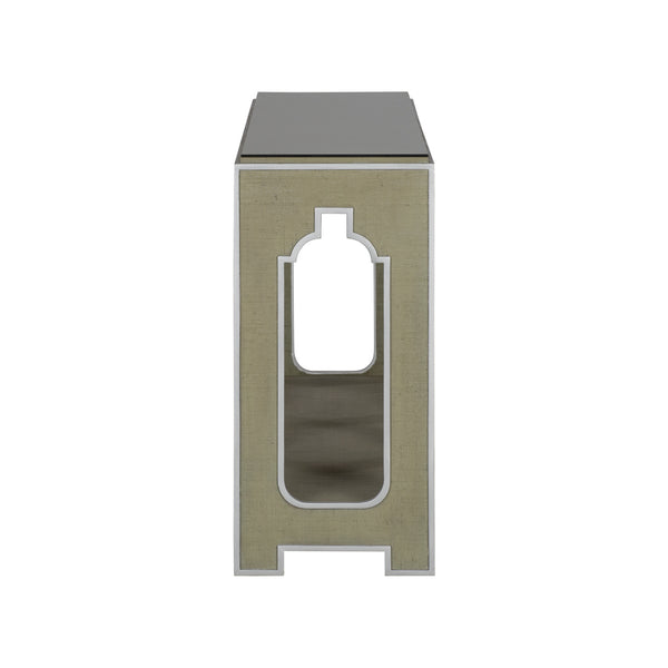 Our textural Yangon Moss Raffia Console from designer Jamie Merida invites global styling to your home. This eye catching piece features arched cutouts and painted gold detailing. Topped with glass for added protection. This design forward green raffia console has a lower shelf, making it a stylish spot for your decorative accessories, dinnerware or stacks of your favorite books.