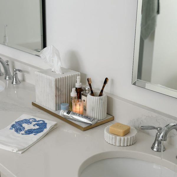 Our charming Twin Tigers Hand Towel is as pretty as it is practical. A pair of exotic tigers are embroidered in classic blue thread on a white cotton flour sack towel. This classic towel will bring Chinoiserie inspired style to any kitchen or bathroom.