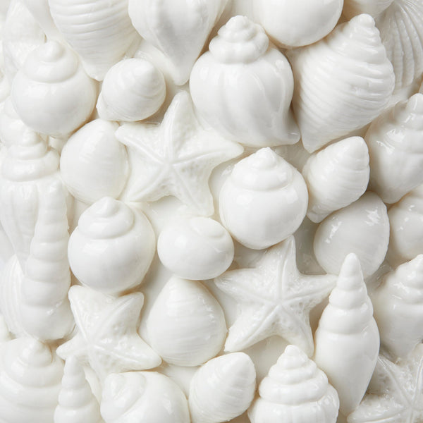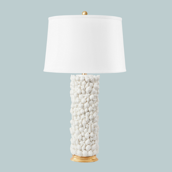 Our Budding Blanc de Chine Lamp is a delicate yet eye-catching accent, crafted from Blanc de Chine porcelain and adorned with a cascade of tiny seashells. Evoking the beauty of the shore, its textured form radiates coastal charm. A gold-leafed base and finial lend an added touch of elegance and warmth, making it a refined statement piece for beach-inspired or transitional interiors. This timeless white porcelain table lamp is topped with a crisp white laminated linen shade, accented with gold hardware.