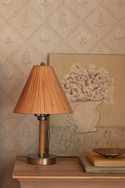 The Delphine Mini Table Lamp is inspired by a quintessentially Parisian apartment on the Left Bank. This charming small scale lamp is versatile enough for almost anywhere in your home with its finely balanced proportions and clean, feminine lines. Rattan is expertly wrapped around its slender frame, complemented with a richly textured handcrafted rattan shade, brass accents, and a vintage-inspired wrapped cord that effortlessly blends with bedrooms, entryways, and beyond.