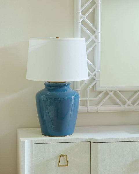Our Aksel Cruise Teal Lamp makes a bold statement with its voluminous ginger jar silhouette and short, rounded neck. Crafted in ceramic and finished with a thick, luscious Teal Blue glaze, the Aksel Lamp exudes timeless charm from every angle. The generous scale gives it presence, while the smooth curves and high-gloss surface lend a cool, grounded feel.