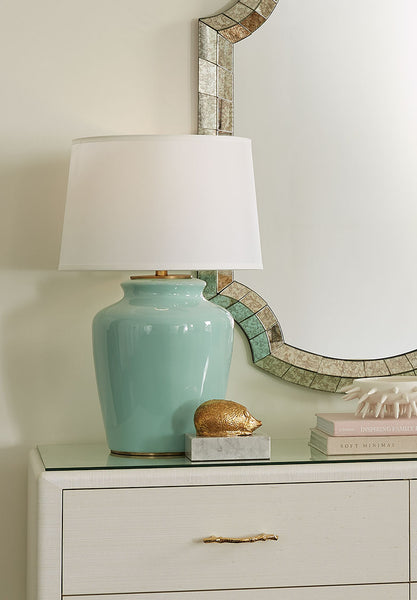 Our Aksel Pacific Teal Lamp makes a bold statement with its voluminous ginger jar silhouette and short, rounded neck. Crafted in ceramic and finished with a thick, luscious ocean inspired teal glaze, the Aksel Lamp exudes timeless charm from every angle. The generous scale gives it presence, while the smooth curves and high-gloss surface lend a cool, grounded feel.