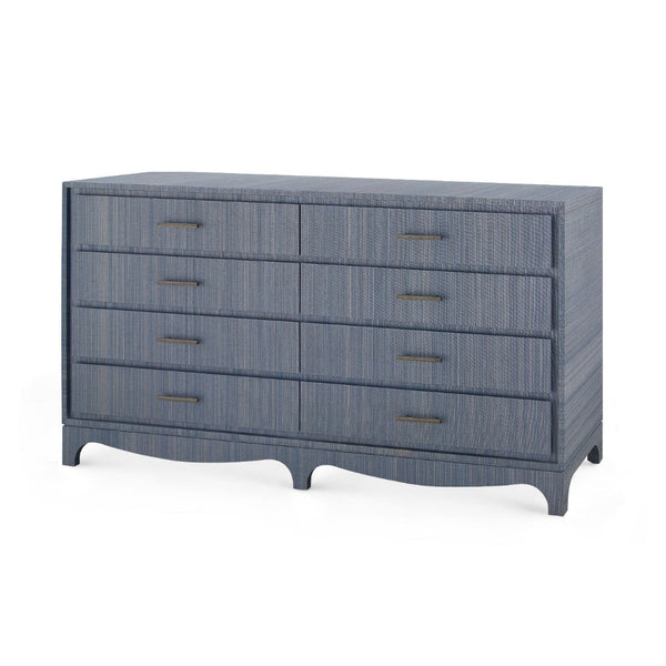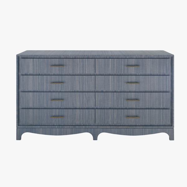 Our textural Banbury Denim Grasscloth Dresser is a simple, yet chic storage piece. The Banbury Collection features a luxe lacquered grasscloth finish, both sleek and textured to the touch. Each piece features a deeply inset drawer front, creating subtle shadow lines and visual depth within its rectilinear frame. Wrapped in clear lacquered grasscloth, the surface highlights natural texture with a clean, modern finish. A gently curved decorative apron softens the silhouette, adding a graceful touch that balances the structured form. Satin bronze-finished hardware completes the look, adding a warm metallic accent that enhances the collection’s tailored aesthetic. With its thoughtful proportions and material richness, the Banbury Denim Blue double dresser offers a sophisticated take on everyday storage and style.