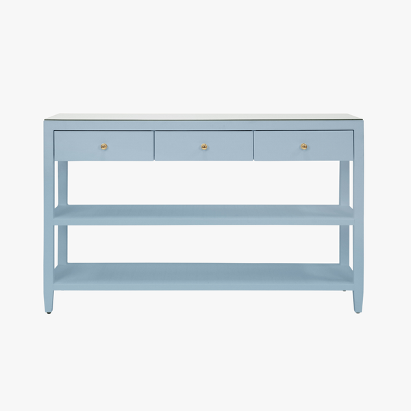 Our Brayden Light Blue Console Table brings timeless style to any interior with its simple, yet chic, form and allover texture. Three inset storage drawers with petite brass pulls float effortlessly above two open shelves. This eyecatching piece is a charming addition to well appointed interiors, whether placed in a beachside bungalow or urban abode.