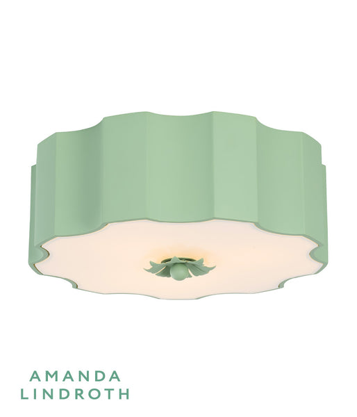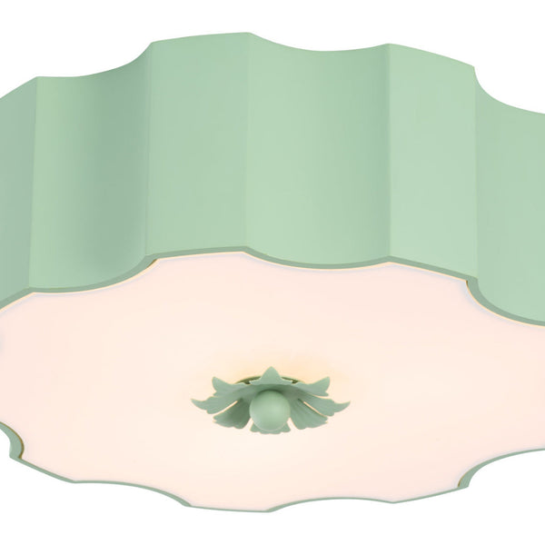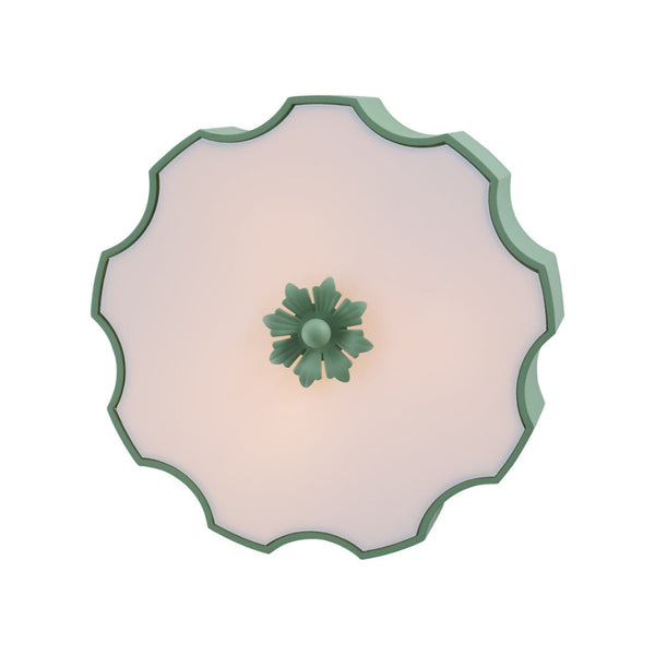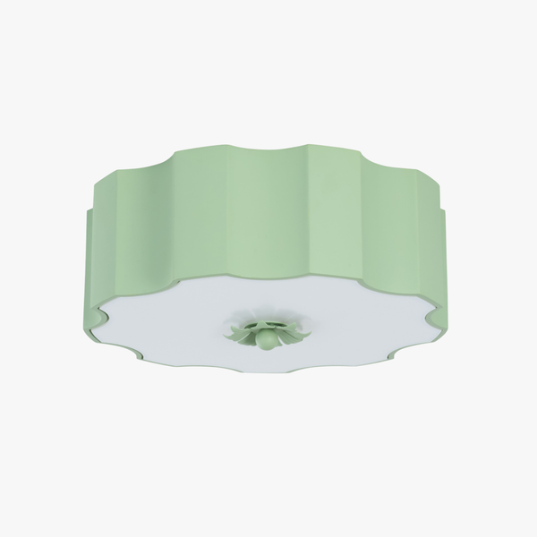 Our charming Fancy Wiggly Flushmount from designer Amanda Lindroth features a sculptural metal shade with a wavy silhouette, finished in a fresh painted spring green. A frosted glass diffuser softens the light, casting a warm, inviting glow while the decorative finial adds a thoughtful design detail. Perfect for bedrooms, entryways, or cozy nooks.