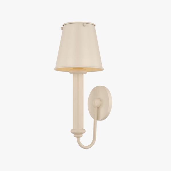 Our charming Grantham Bisque Wall Sconce brings a whimsical touch to the wall, celebrating color and character in equal measure. A substantial candle sleeve anchors the design, while soft accents along the arm and canopy add timeless style. A matching metal shade completes the fixture, creating a cohesive all-over finish.
