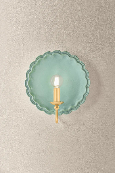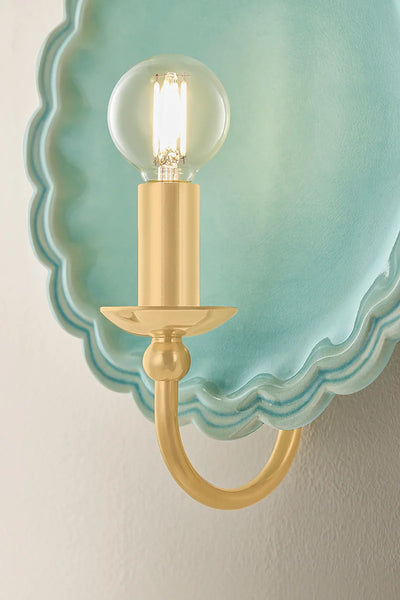 Our charming Pierce Celadon Wall Sconce embodies the spirit of new romanticism, transforming functional lighting into artful expression. A hand-sculpted scalloped edge ceramic backplate creates an expressive vignette. The aged brass goose neck arm introduces a heritage detail that completes the timeless look.