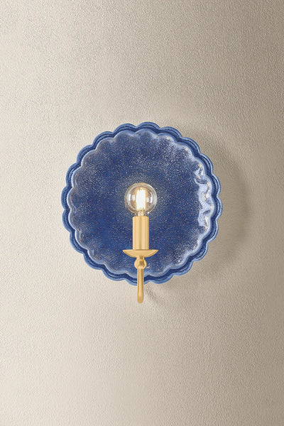 Our charming Pierce Denim Wall Sconce embodies the spirit of new romanticism, transforming functional lighting into artful expression. A hand-sculpted scalloped edge ceramic backplate creates an expressive vignette. The aged brass goose neck arm introduces a heritage detail that completes the timeless look of this blue ceramic sconce.