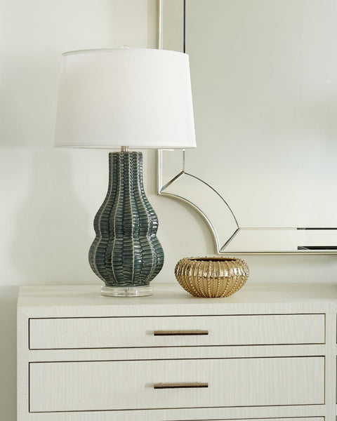 Our Quinn Veridian Green Lamp features a classic double gourd silhouette elevated by a woven basketweave texture that adds depth and charm. Crafted from ceramic and finished with a semi-transparent glaze, the surface reveals subtle variations where the glaze pools, allowing the natural ceramic to peek through. The result is a rich, tactile finish with organic character. A clear acrylic base and matching finial give the piece a clean, contemporary edge, making the Quinn a beautiful blend of texture, shape, and light-catching detail—perfect for both casual and collected interiors.