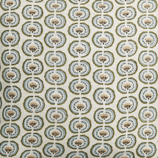 Our Okinawa Moss Celadon Pillow Cover from Walter G features features a floral motif inspired by glorious examples of antique suzani embroidery. Hand block printed on 100% linen in serene shades of blue, green and blush.