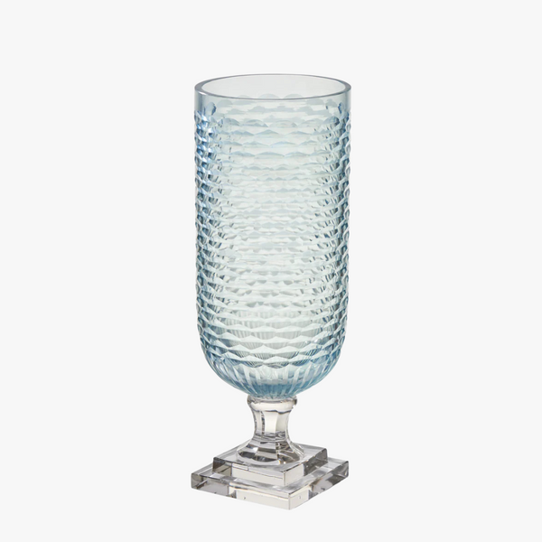 Our handcrafted Pale Blue Cut Glass Hurricane is a timeless addition to any well appointed interior. Inspired by vintage glassware designs, this cut glass hurricane can be used as a candle holder, or a vase for you favorite flowers and greenery. A stacked square pedestal base anchors this eye catching blue glass decorative hurricane.