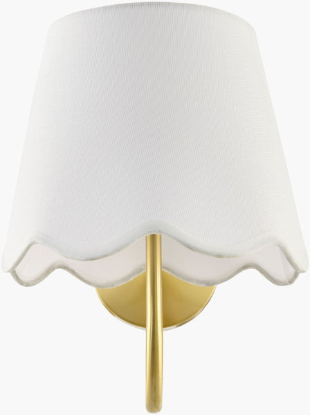 Our scalloped edge Elsie Woven Rattan Wall Sconce will lend texture and classic styling to any well appointed interior. This crisp white linen scalloped edge wall sconce is the perfect addition to any decor, whether placed in a coastal cottage or urban abode. Add this gold finish wall sconce as a charming accent to a bathroom, hallway or reading nook for a designer layered lighting look.