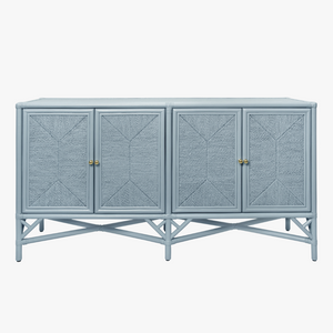 Our textural Essa Light Blue Sideboard is tailored in finish and design, pairing clean lines and natural materials. Charming details include vintage inspired design elements, textural woven rope panels, and petite brass hardware. This versatile four door storage piece will lend a sense of casual coastal styling to well appointed interiors, whether placed in an entry way, living or dining room.