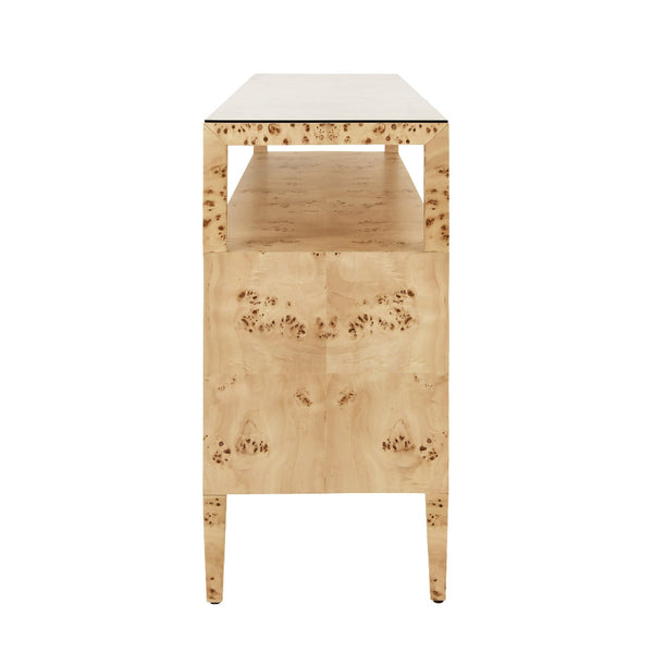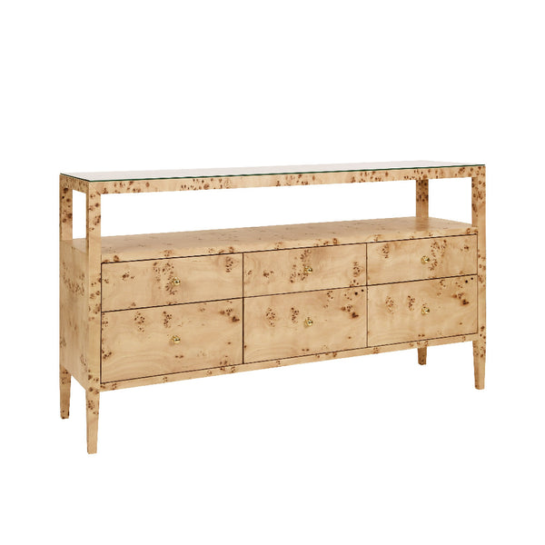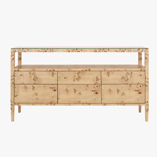 Our Damien Burl Console Table brings timeless style and subtle elegance to any room with its sophisticated form and allover graining. Six roomy inset storage drawers with petite brass pulls sit elegantly beneath an open storage shelf. This eyecatching storage piece is a charming addition to well appointed interiors, whether placed in a beachside bungalow or urban abode.