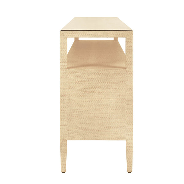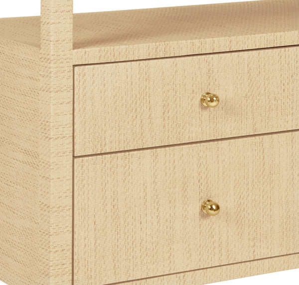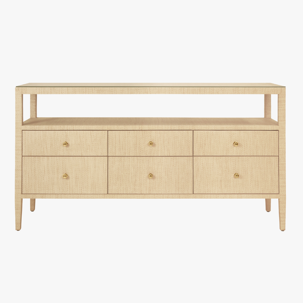 Our Damien Natural Grasscloth Console Table brings timeless style and subtle elegance to any room with its sophisticated form and allover texture. Six roomy inset storage drawers with petite brass pulls sit elegantly beneath an open storage shelf. This eyecatching grasscloth storage piece is a charming addition to well appointed interiors, whether placed in a beachside bungalow or urban abode.
