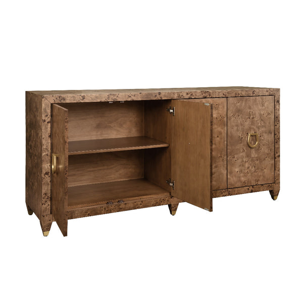 Our four door Maddox Dark Burl Buffet exudes timeless style with its sophisticated silhouette and allover burl wood graining. This versatile sideboard is the perfect storage solution for any living or dining space. The Maddox Buffet is accented with bold horsebit inspired hardware for a designer look.