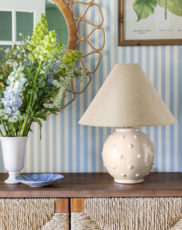 Our classic Annabelle Lamp designed by Ariel Okin for Mitzi features a tapered natural linen shade over a rounded ivory ceramic base. The raised polka dots and subtle crackle in the finish feel fun and chic. This petite table lamp combines form and function and will lend feminine flair to any interior.