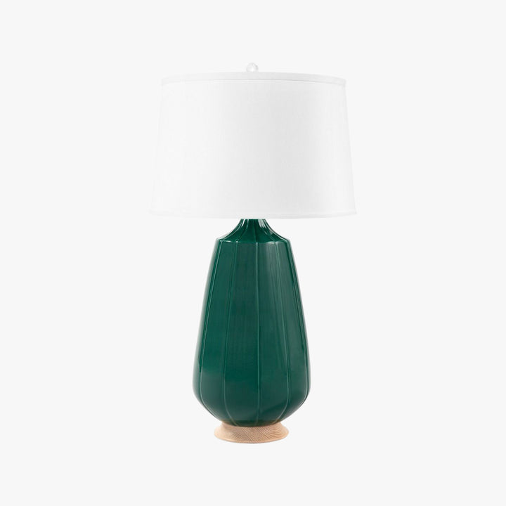 Our Aurora Emerald Green Lamp creates a striking focal point in any decor with its curved neck and incised vertical lines. Updated styling and a modern spirit make this versatile ceramic lamp base a designer favorite. Finished with a cerused wood base and silver cord. Aurora is topped with a crisp white laminated linen shade, accented with nickel hardware.