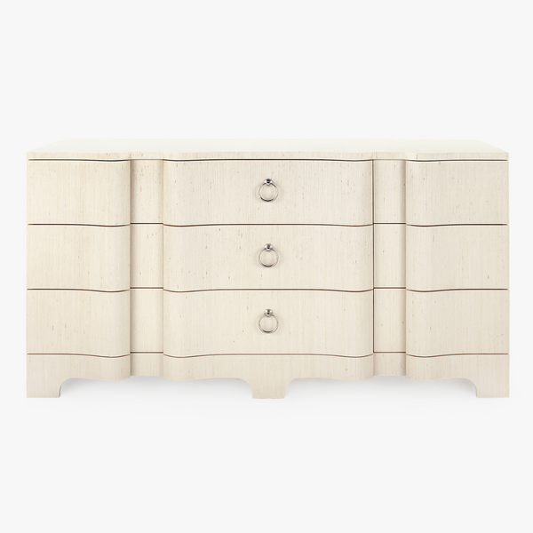 Our timeless Biarritz Natural Grasscloth Dresser features sweeping serpentine curves and a textural grasscloth finish. A charming play on form, the facade of the Biarritz large dresser evokes a sense of fluid movement, with the nine drawers expertly crafted to resemble rippling waves.