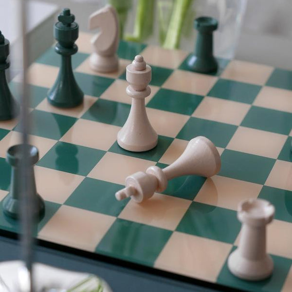 Our 'Classic Chess' boxed game symbolizes timeless strategic gameplay and refined elegance. Designed with attention to detail, this Chess set features wooden game pieces and an MDF chess board with a mounted acrylic top measuring 10x10 inches. It also includes easy-to-read instructions in English, French, and German. Suitable for two players and recommended for ages 5 and above. Step into the world of classic board games with our exclusive Classic Game Series. With a clean, minimalistic design translated into vivid colors, they will elevate your home decor wherever you place them. Whether played or displayed, they are guaranteed to win.