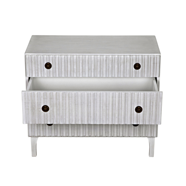 Our Daryl Whitewash Dresser from NOIR is an instant classic with its unique textural ribbed carving on the drawer fronts. Finished in a versatile white wash, this solid mahogany three drawer chest is the perfect addition to any bedroom or living space. Classic lines, and vintage inspired hardware combine with the ribbed detailing for timeless style.