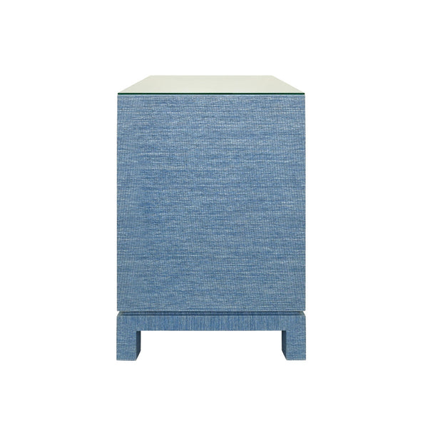 Elevate your space with the Edmond Blue Grasscloth Nightstand, a perfect blend of timeless elegance and modern sophistication. Carefully wrapped in a rich blue grasscloth, this piece exudes rich texture and classic style. The oversized square antiqued brass hardware adds a refined touch, making it a true statement in any room. Whether placed next to a bed, or flanking a sofa in the living room, this versatile two drawer nightstand brings a sense of quiet luxury and elevates any well-appointed interior. It’s the perfect combination of function and style for your home.