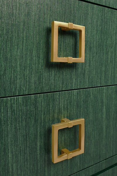 Elevate your space with the Edmond Forest Grasscloth Nightstand, a perfect blend of timeless elegance and modern sophistication. Carefully wrapped in a deep green grasscloth, this piece exudes rich texture and classic style. The oversized square antiqued brass hardware adds a refined touch, making it a true statement in any room. Whether placed next to a bed, or flanking a sofa in the living room, this versatile two drawer nightstand brings a sense of quiet luxury and elevates any well-appointed interior. It’s the perfect combination of function and style for your home.