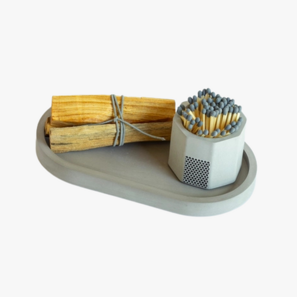 Our Grey Match Striker and Tray is the perfect companion to your favorite scented candle. Each match stick holder is hand-poured concrete with a cork bottom to protect your surfaces. Each set comes with grey tipped matches included. The matches are approximately 1.85 inches. There is also a striker pad attached to the side of your holder for easy lighting.