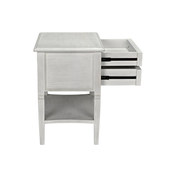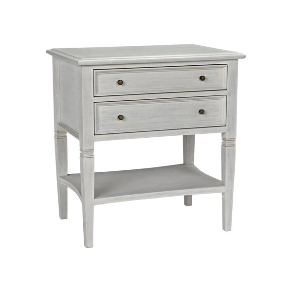 Our timeless Oxford Whitewash Side Table features two storage drawers accented with simple brass hardware. A lower shelf is perfect for keeping books and magazines close at hand. This versatile whitewash mahogany side table functions well as a nightstand in the bedroom or accent table in any living space where extra storage is desired.