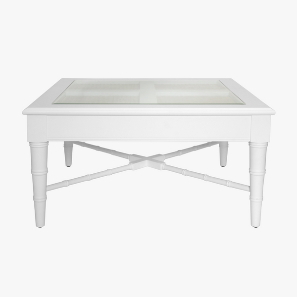 Our Pennine White Coffee Table features a crisp matte lacquered base with charming bamboo inspired styling. This versatile square coffee table is topped with four inset woven cane panels and glass, for an airy look. Pennine is the perfect addition to any living space, whether placed in a coastal cottage, city apartment or stylish suburban abode. With timeless design and a mix of natural materials, the Pennine White Lacquered Coffee Table is an instant classic!