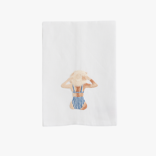 Our charming Poolside Embroidered Hand Towel will bring summertime style to your home. This luxe little white linen coastal inspired fingertip towel is a welcoming touch to guest bathrooms.